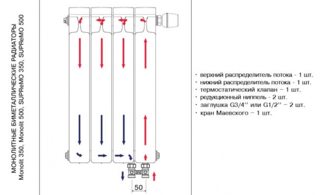 Специально для нижнего подключения разработано конструктивное исполнение алюминиевых и биметаллических радиаторов. Такое исполнение имеет обозначение VENTIL. В зависимости от выбранной модели после сборки радиатор сохраняет все ее теплотехнические и эксплуатационные характеристики. При разработке проекта системы отопления необходимо учесть гидравлические особенности узла нижнего подключения и термостатического клапана согласно оговоренной комплектации.
