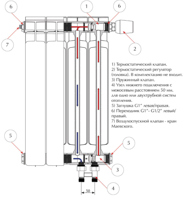 Специально для нижнего подключения разработано конструктивное исполнение алюминиевых и биметаллических радиаторов. Такое исполнение имеет обозначение VENTIL. В зависимости от выбранной модели после сборки радиатор сохраняет все ее теплотехнические и эксплуатационные характеристики. При разработке проекта системы отопления необходимо учесть гидравлические особенности узла нижнего подключения и термостатического клапана согласно оговоренной комплектации.
